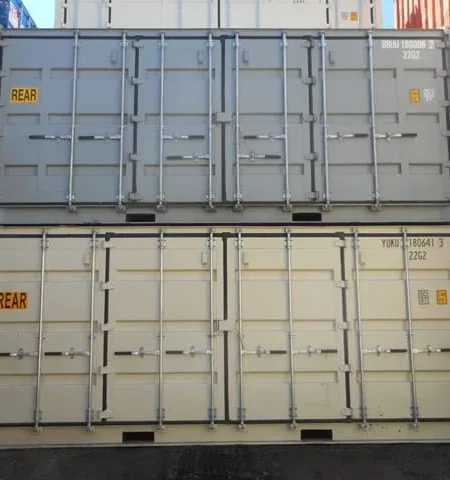 Contenedor Openside de 20 pies con puertas laterales plegables y doble puerta frontal. Disponible en alturas estándar (8’6″) y High Cube (9’6″). Ideal para cargas voluminosas. Entrega en España disponible.